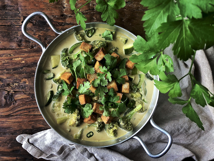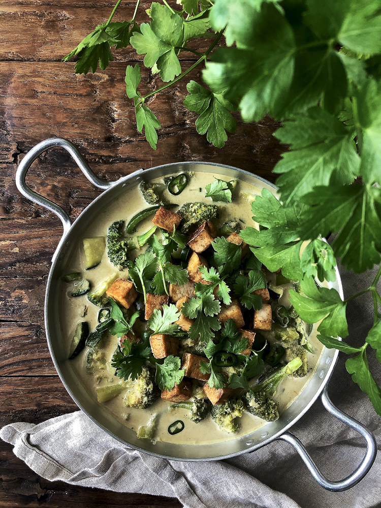 Tofu on parhaimmillaan ja rapeimmillaan, kun sen lisää curryn joukkoon vasta lopuksi. Vihreä curry saa loppusilauksen tuoreesta korianterista sekä paahdetuista pähkinöistä.